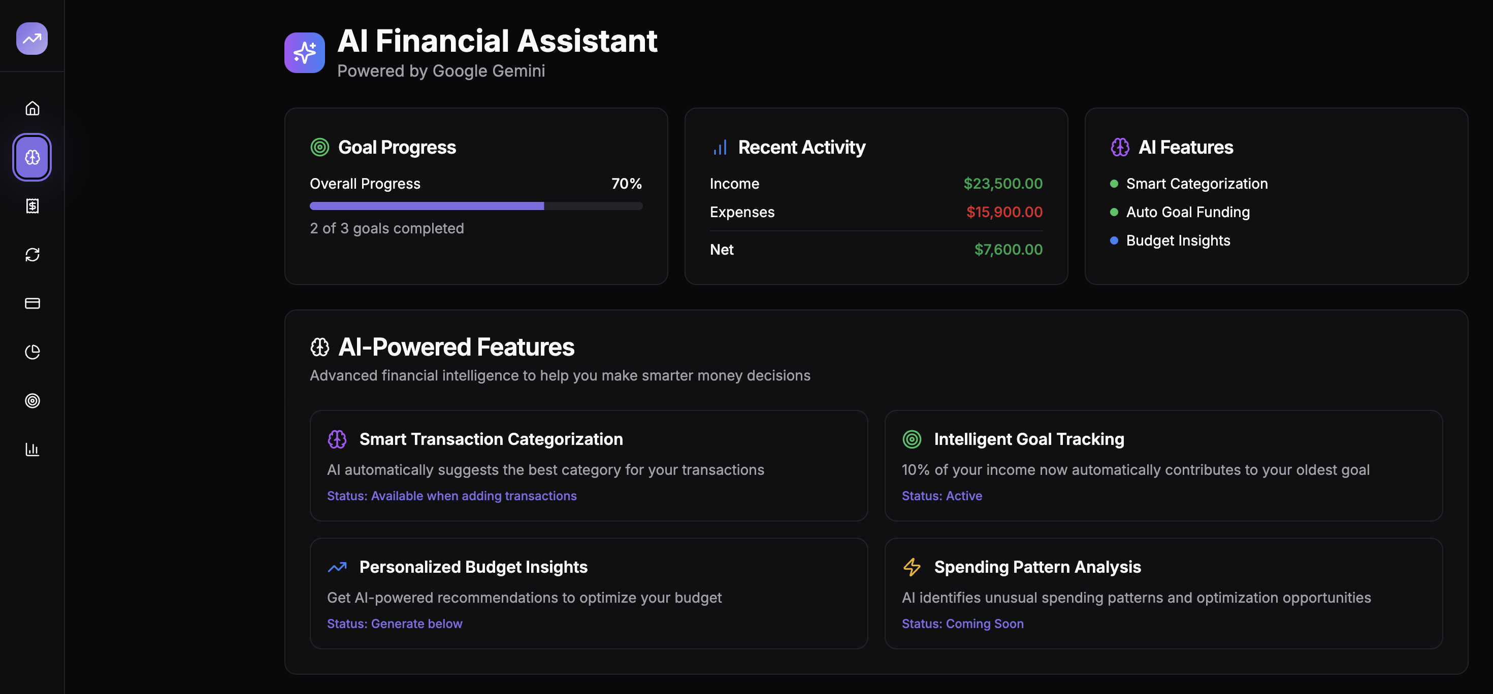 - 🤖 AI-Powered Financial Insights: Advanced algorithms analyze spending patterns and provide recommendations